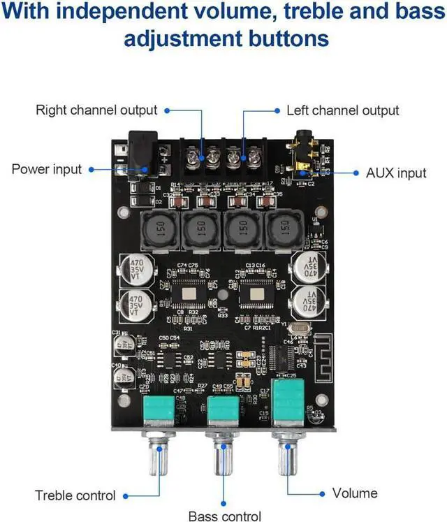 Treble and Bass AdjustmentThis 1002T digital Amp board with independent treble and bass adjustment buttons,you can directly adjust the treble and bass through the module, without using the player or speaker. For those with more demanding music sound effects, they can adjust the treble and bass buttons to adjust the sound effects to suit their style