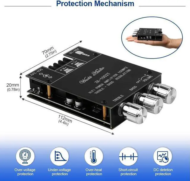 With Protective FunctionThis Bluetooth Amp module is designed with over-voltage protection, under-voltage protection, over-heat protection, short-circuit protection, with case to protective it