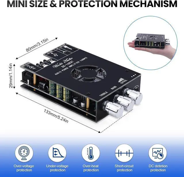 With Protective FunctionThis Bluetooth Amp module is designed with over-voltage protection, under-voltage protection, over-heat protection, short-circuit protection, with case to protective it