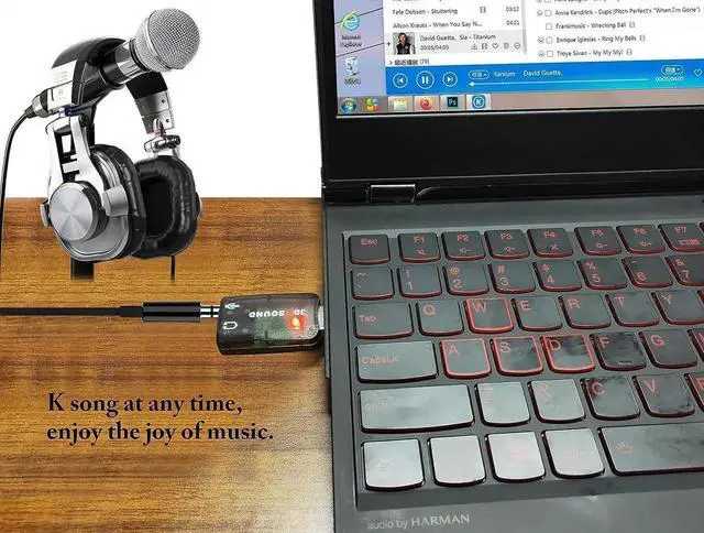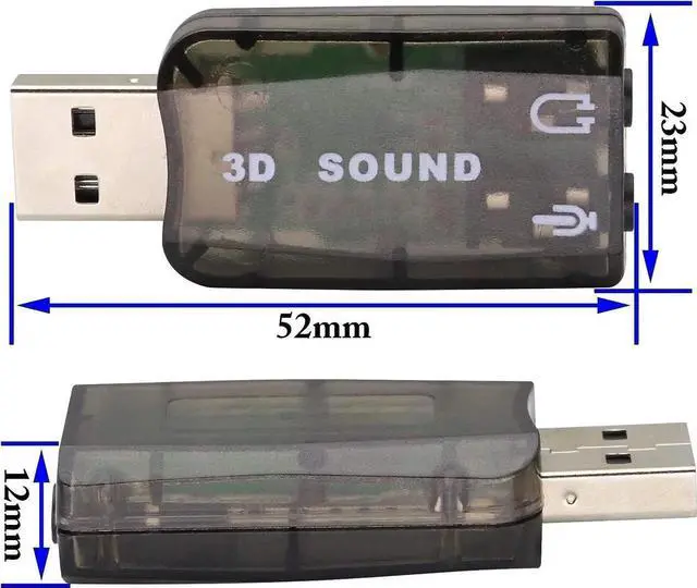 Color:Black Specification: Size: 5 x 2.2 x 1.2cm Weight: 21g Pakcage content: 2 x 3D Audio Sound Adapter Features: Virtual 5.1 USB sound card Supports 3-dimensional sound With no external drivers required For a failed audio card in a laptop Compensates any desktop speakers with 3.5 mm cable Connector/Ports: 1 USB connector, 1 x 3.5mm audio jack, 1 x 3.5mm mic jack Description: This is a 3D External Sound Card that uses an USB plug, giving you the flexibility and convenience of experiencing quality 5.1 digital surround sound in a small and compact form. The card has two jacks for headphones and microphone respectively, it's perfect for enjoying great audio on systems such as Xbox 360 or PS3.