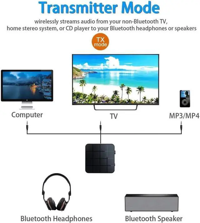 Switch between transmitter and receiver modes with the simple flick of a switch. Effortlessly connect using advanced Bluetooth technology and 3.5 mm audio cable (included).