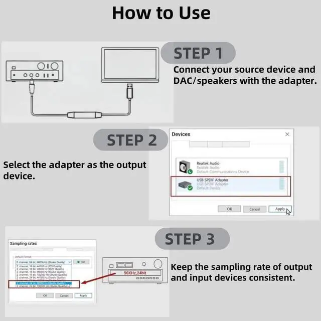 Crystal Clean High-Resolution Sound USB A to S/PDIF fiber optic audio connector delivers crisp and clear high-resolution sound at 48KHz/24-bit, 96KHz/24-bit, and 192KHz/24-bit with excellent clarity and rich audio detail.