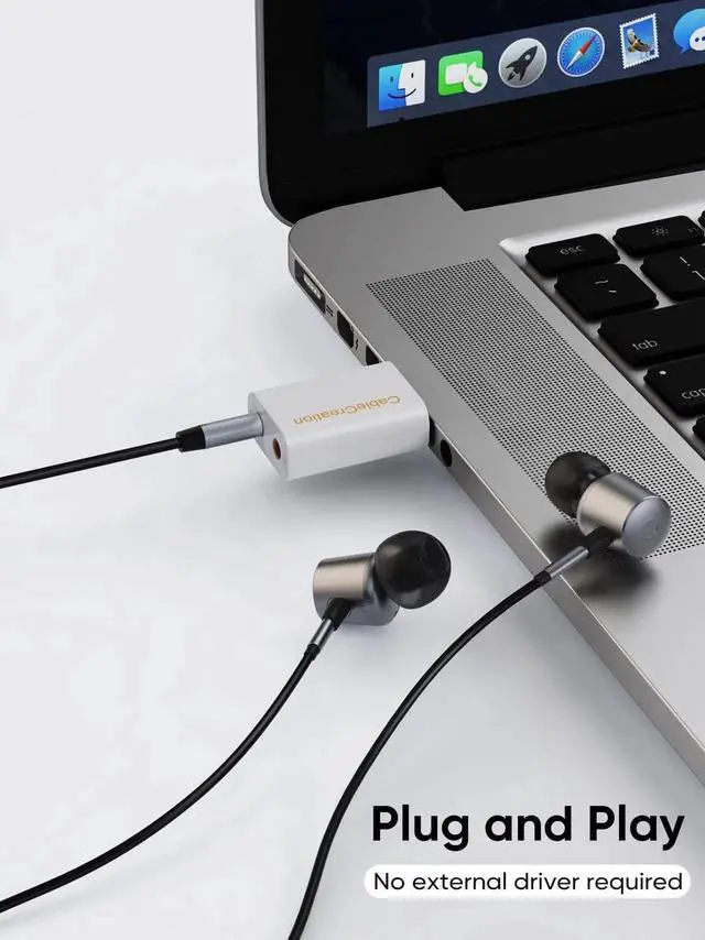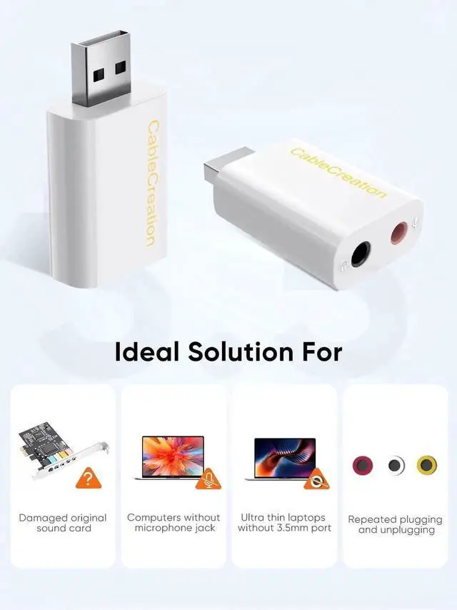 Side 1: USB 2.0 Male Port Side 2: 2 x DC3.5 Female Port Stereo output jack, Mono microphone-input jack Housing: ABS Shell Backward compatible with USB 1.1 Compatibility System Win7, Win8, Win XP, Vista, Mac, Linux