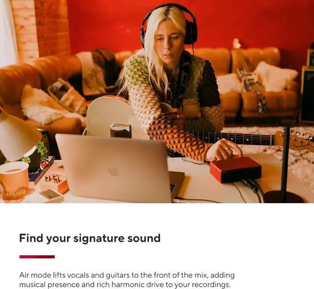 Find your signature sound: Scarlett 4th Gens improved Air mode lifts vocals and guitars to the front of the mix, adding musical presence and rich harmonic drive to your recordings.