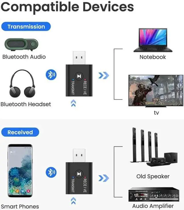 1. In transmitter mode, turn non-Bluetooth TV, PC, CD player for iPod, MP3 / MP4 into Bluetooth transmitter. Receiver mode: Ideal for home or car music streaming sound systems.