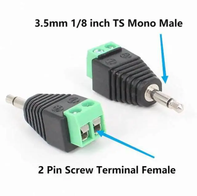 Package Contents:2 pcs 3.5mm TS Mono Male to 2 Pin Screw Terminal Female 1/8 Inch TS Audio Plug AUX Headphone Solderless Balun Converter Adapter.