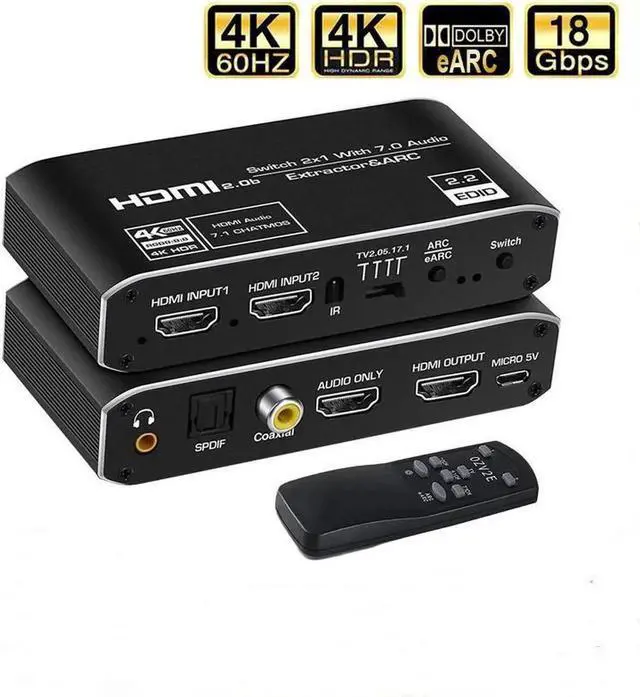 1. The 2x1 4K 120Hz HDMI 2.0 Switch eARC audio extractor is a high-performance 2 HDMI input and 1 HDMI output switch with audio output. HDMI/Theslink/ 3.5 mm jack audio output supports audio extraction function, only audio HDMI/Theslink/coaxial supports ARC (audio return channel), only audio HDMI supports eARC (enhanced audio return channel). Except for Gao Da 4Kx2K@60 /120Hz