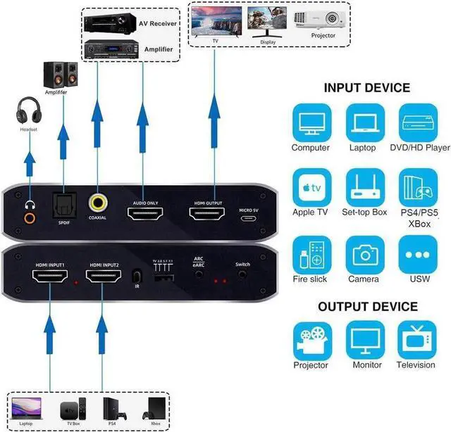 10. HDMI audio extractor - With optical TOSLINK SPDIF+coaxial+ 3.5 mm+HDMI audio output, it can extract the sound from HDMI input sources (such as PS5/4, Xbox one, etc. ) to the speaker or amplifier without connecting to a TV or monitor.