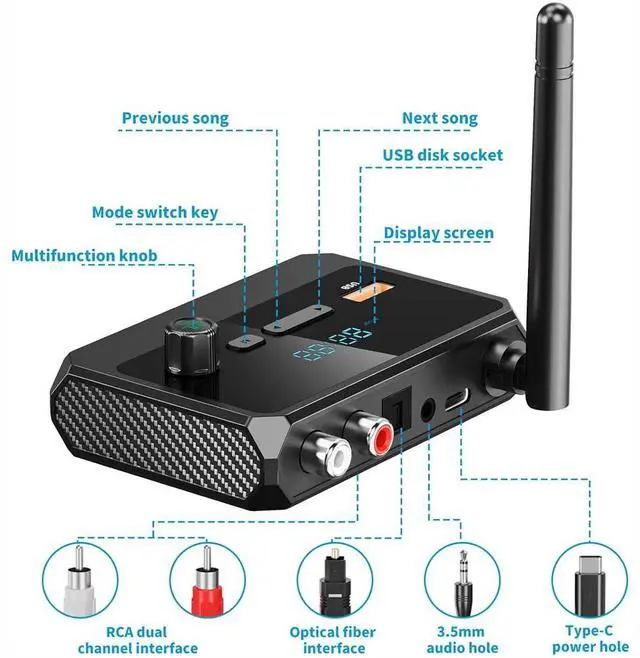 - Compatible with 99% of audio systems, the adapter supports RCA, 3.5mm aux, and digital optical outputs, as well as a USB drive port for direct music playback. Whether you're using it with AV receivers, car stereos, or home speakers, it offers versatile connectivity for any setup.