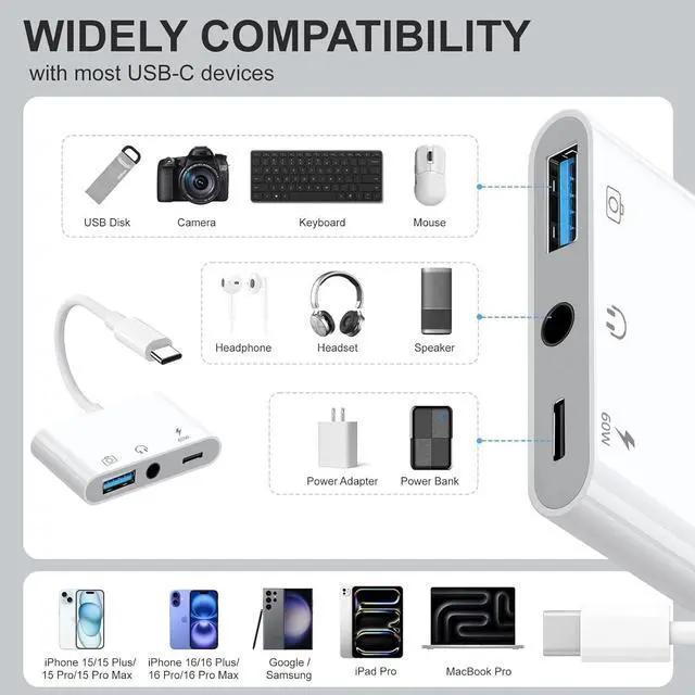 USB C PD 60W FAST CHARGING - The aux to USB C to USB adapter support fast charging with a maximum output of 60W(20V/3A). Tin plated pure copper conductor provides safe and stable fast charging performance. You can quickly charge your devices at any time and dont suffer low battery anxiety saving you even more time. WIDE COMPATIBILITY- The aux to USB C to USB adapter plug and play no need APP. The USB OTG adapter is compatible with most Type-C interface phones iPhone15/16 iPad Pro laptops and players. Such as iPad Pro 2018/2020/Mac Pro/iPad Air/iPad Mini/MacBook Pixel 3/3 XL/2/2XL Galaxy S22 S21 S20 S20+ Note 20 mate 30 20 10 Pro/P30/P20 and more USB C Phones and tablets.