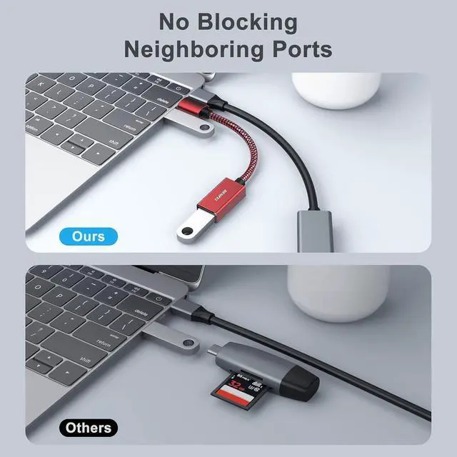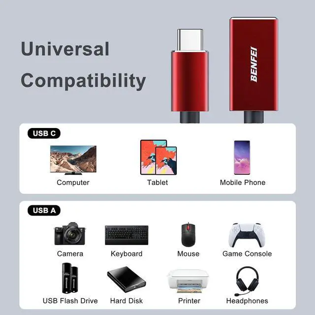 COMPACT DESIGN - The compact-designed portable Benfei USB-C male to USB 3.0 female adapter connects a computer desktop laptop or other devices with USB-C port to a legacy USB devices with USB 3.0 / 2.0 port; The advanced design ensure no inteference when two usb-c slot are closed the client cuold use two closed USB-C slot simultaneouslyINCREDIBLE PERFORMANCE - The USB-C male to USB 3.0 female converter could sync movies music and more in seconds with a 5 Gbps transfer speed. Nickled-plated USB-C/USB connector resists corrosion and abrasion and improve the signal transmission performance; Braided nylon cable for extra durability and user-friendly non-slip design for easier plug and unplug.