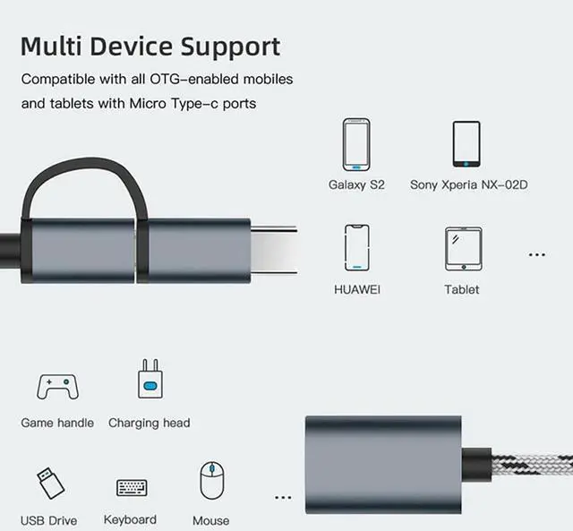 Use: The OTG adapter supports digital cameras USB flash drives keyboards mouse and gamepads microphones mixers sound cards electronic drums etc. (the maximum current of peripherals does not exceed 200 mA) SSD is NOT supported