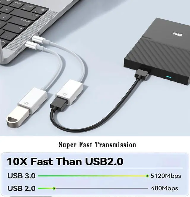 Upgraded Version: This iPhone USB-C to USB Camera Adapter support USB 3.0 transmission speed up to 5Gbps And it also support USB 2.0 The transfer speed is 25MB/S-30MB/S which is 2 times faster than others help you save time.