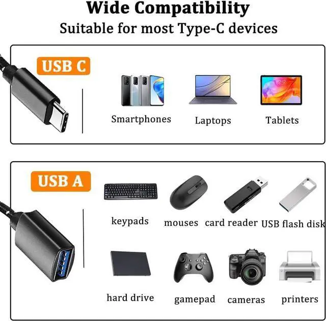 The usb c to usb adapter is ideal for connecting the USB-A enabled devices to the devices with the Type-C intterface. To meet your needs of watching movies playing games writing documents. The transfer speed of Type C Male to USB Female OTG Cable is up to 480MB/s It will transfer the large files pictures music and movies to your USB-C device in seconds. Wide Compatibility. The USB C OTG Adapter compatible with iPhone 16 Pro Max/16 Plus/16/15 iPad Pro 2023/2022 MacBook Pro/Air 2020/2019/2018/2017/2016 Galaxy S24/S23/S22/S21 Surface Book LG G6 G5 V20 and other USB Type-C devices.