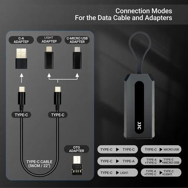 Package Includes: 56cm / 22 Type-C to Type-C Cable x 1 Type-C to Light Adapter x 1 Type-C to Micro USB Adapter x 1 Type-C to Type-A Adapter x 1 OTG Adapter x 1 Card Removal Tool x 1 Storage Case x 1. Design for Traveling with