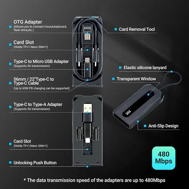 HIGH CAPACITY: Can storage TF Card x 2 Nano SIM Card x 2 Card Removal Tool x 1 56cm / 22 Type-C to Type-C Cable x 1 Type-C to light Adapter x 1 Type-C to Micro USB Adapter x 1 Type-C to Type-A Adapter x 1 OTG Adapter x 1.