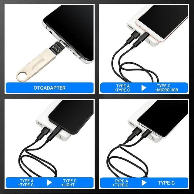 Charging Cable Adapter: Type-C to Type-C (Supports PD 65W charging) Type-C to light (Supports 2A transmission does not support iPhone 20W fast charger) Type-C to Micro USB (Supports 3A transmission) Type-C to Type-A (Supports 3A transmission) OTG Adapter (For connecting mouse keyboard flash drive etc. )
