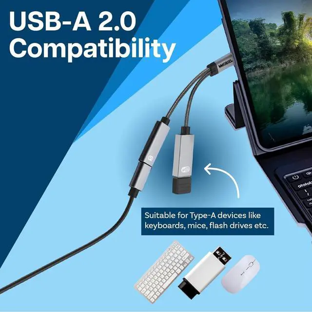 2 in 1 Splitter The USB-C splitter turns a single USB-C port into a USB-A and USB-C port. The USB-C Splitter can be connected to any USB-C device. It gives your USB-C host devices an opportunity to connect all kinds of USB-A add-ons to your smartphone tablet or laptop while the USB-C port charges your device simultaneously. Female USB-C Port The USB-C splitter has two output ports: a female Type-C PD charging port and a female USB-A port. The Type-C port is compliant with PD 3.0 and supports up to 60W charging (max 20V/3A) making it suitable for Type-C devices like phones tablets and laptops. The USB-C port is only for charging and not for data transfer. Female USB-A Port The female USB-A 2.0 port has a power supply capacity of 50mA making it ideal for connecting keyboard mouse flash drive etc. This port is NOT designed for devices that demands higher power loads. This female Type-A port is capable of 480Mbps data transfer. Compatibility The Type-C plug of the USB-C adapter works with the latest USB-C type devices like Phones Tablets and Laptops. The splitter is compatible with iPad iPhone 16 15 MacBook Galaxy Tab Galaxy S Series Xiaomi Oppo Chromecast Google TV Laptops Surface Book and more.