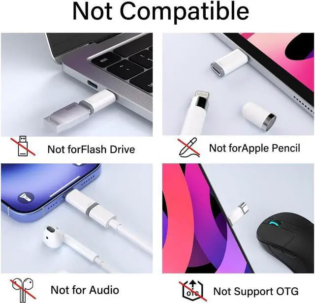 Please: the lightning to usb c adaptor can charge and data sync between your phone and computer. Not support OTG video and audio functions headphones Not for Pencil (1st generation) mouse keyboard flash drive card reader printer microphone camera etc HDMI converter etcDurable