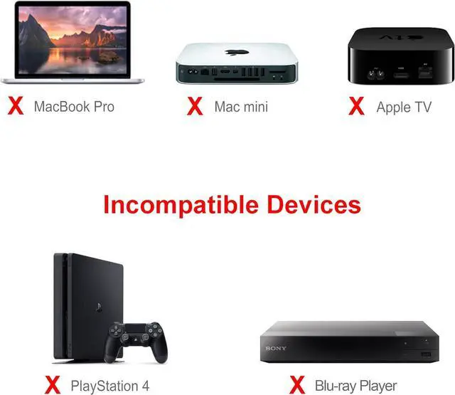 COMPATIBILITY: The HDMI-VGA adapter is compatible with computer pc desktop laptop ultrabook notebook Chromebook Raspberry Pi Intel Nuc PS3 Xbox One Xbox 360 Wii U Set Top Box TV BOX or other devices with HDMI port; NOT compatible with Blu-ray player and devices with low-power HDMI ports such as SONY PS4 MacBook Pro with Retina Display Mac mini and