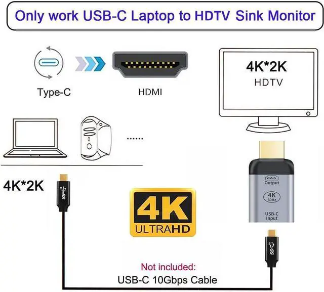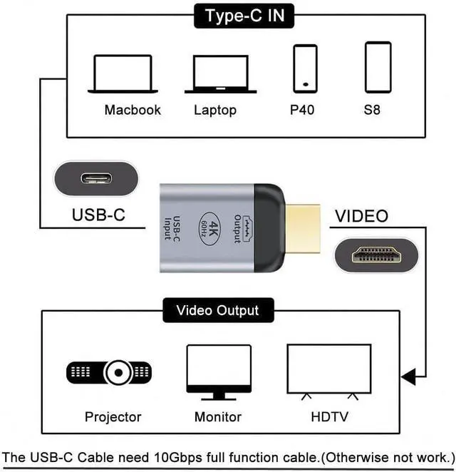 Note: The input device must be used with a USB-C to USB-C data cable that supports the full functions of USB 3.1 10gbps. The adapter can't work for usb-c monitor to HDMI source. You can connect the 10Gbps USB-C to USB-C Cable to the adapter Then connect it to the HDMI displays. You need to use the 10Gbps usb-c to usb-c cable. (Other Cable not work) USB type C USB 3.1 C Male Connector to HDMI Multiport Adapter for New MacBook Surface Pro 4 Google New Chromebook Pixel Surface Go etc. USB-C HDMI Adapter lets you connect your MacBook with USB-C port to any HDMI display or projector. 4k and 1080p 60hz HD resolution to enjoy entertainment as it was meant. This adapter allows you to mirror your MacBook display to your HDMI-enabled TV or display. The adapter also support phone like samsumg S8/s9/s10/Note8/note9/note10 and Mate10/Mate20/P20/P30