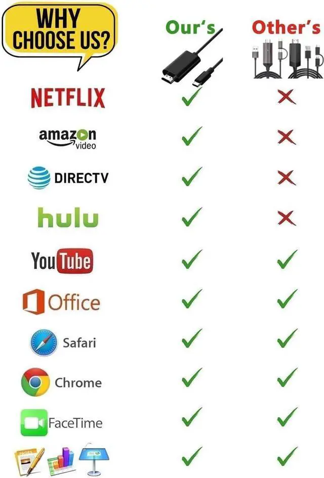 Let you have a great experience on your mobile world playing phone game on tv working with projector & even driving w/ car play. Type C to HDMI Adapter - Support Apps include YouTube Hulu Plus IDMB Quickflix Family On TV ABC NBC FOX Office and more videos downloaded and saved on your IOS and Devices for stream. Not Compatible with Apps which have C0XPHDCPC0XP video copyrights protection like Netflix iTunes movies video HBO go HULU and Honda motor.