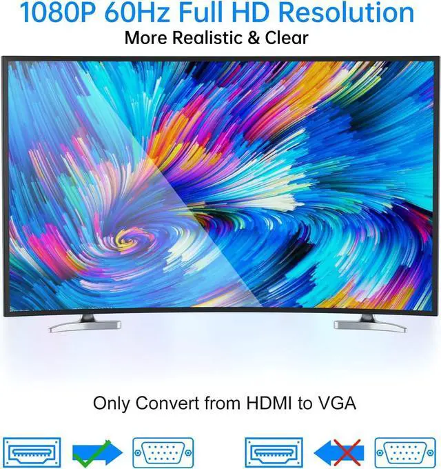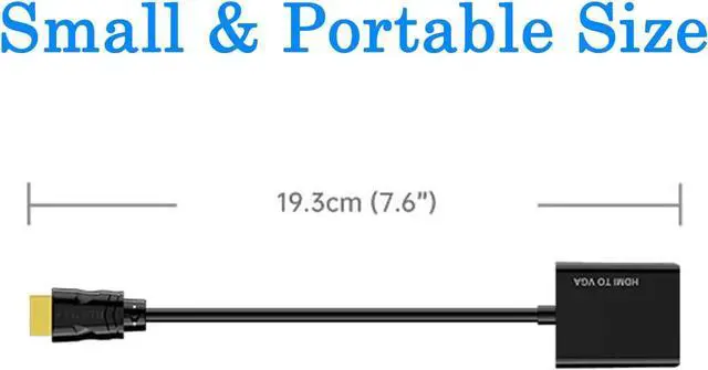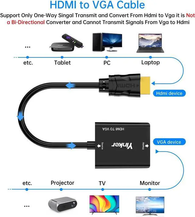 HDMI to VGA Adapter - portable converter transfer signals from HDMI devices to VGA devices. It's perfect for bussiness conference or presentation display your HDMI Computer/laptop/desktop into VGA monitor/projector/HD TV. HDMI to VGA Converter is the one way transmission only from HDMI source to VGA display cannot transfer signal from VGA source to HDMI display. Excellent Material - The Gold-plated connector and PVC jacket is anti-corrosion flexible and durable which can prolong cable life. The built-in high-quality low-consumption AG6200 smart chip can transfer stable and non-lap signal. Wide Compatibility - Resolution up to 1920*1080@60Hz full 1080P HD.
