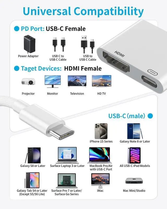 HDMI cable not includedBroad compatibility: 2 in 1 Type-C to HDMI Adapter for iPhone 17/16 to TV can work with devices equipped with USB-C ports that support DisplayPort Alternate Mode compatible for iPhone 17/17 Air/17 Pro/17 Pro Max/16e/16/16 Plus/16 Pro/16 Pro Max/15/15 Plus/15 Pro/15 Pro Max MacBook Pro/Air iPad Pro/AirMini iPad 10 Galaxy S25/S24/S23/S22/S21/S20 Ultra Plus Note Switch Surface Book/Laptop XPS 17/15/13 HP Galaxy Book Pixel Book Chromebook Pixel Slat Googel Pixel 10/9/8/7/6/5/4/3 etcThunderbolt to HDMI Converter Sycn