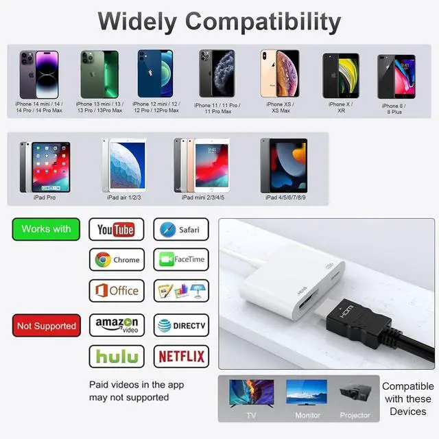 ?? Supported Applications This iPhone Lightning to HDMI adapter supports YouTube Hulu Plus IDMB Quickly Family On TV ABC NBC FOX and local videos. Due to HDCP copyright protection the iphone to hdmi adapter does not support paid videos such as Netflix/HBO GO/Affinity Player/Prime/Hulu/DIRECTV and other apps.??? Plug and Play No Power NeededNo setup neededsimply connect and go! There's no need to install any drivers or apps or to use personal hotspots or WiFi. Just connect the adapter to an HDMI cable (sold separately) and plug it into your TV. Wait for about 6-10 seconds then click the C0XPTrustC0XP button on your iPhone to establish an automatic connection.