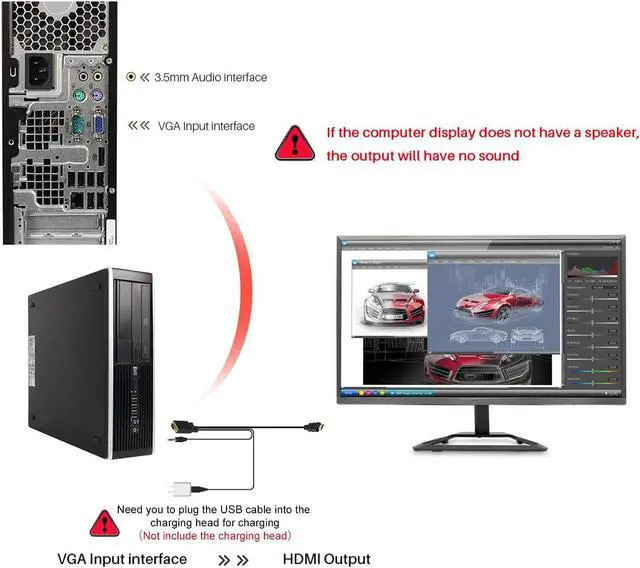 The included USB and 3.5 mm audio cable can supply power and audio output? PURPOSE - Share your video/audio/data from computers or old-styled notebooks desktops laptops that has only VGA ports to any HDMI-equipped devices like HDTVs monitors displayers for big screen viewing