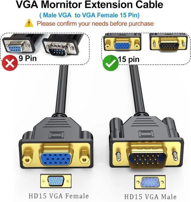 Note: It doesn't support 9-pin VGA devices)Pure Data Stream TransmissionFoil & braid shielding and integrated dual ferrite cores on the VGA wire minimize protect against electromagnetic interference (EMI) and radio frequency interference (RFI) and crosstalk suppress noiseExtremely Wide CompatibleHigh performance VGA cable connects a VGA (Video Graphic Array) equipped computer to a monitor or projector with 15-pin VGA port (also known as RGB DB-15 DE-15 HD-15 HDB-15 or D-sub 15) for video editing gaming or video projection. Ideal for classrooms conference rooms meeting rooms House of worship and many more (NOTE: VGA cable does not have audio functionality)Advantage of Extension VGAVGA video extension cable extends the length of an existing HD15 VGA cord; Connect to a monitor across the room or attach to an existing male to male VGA cable in a hard-to-reach location behind a desk with this VGA monitor cord extender; Extend a KVM switch VGA monitor cable with this convenient computer extension cord for VGA?? Important Note1. This is vga male to female cable not vga male to male cable. 2. The screws on the VGA female head are non removable. 3. This is VGA 15 PIN Extension cable and it is not 9 Pin VGA Cable so It doesn't support 9-pin VGA devices?? 4. Please carefully review the video before use?? Lifetime WarrantyWe offer quality products for a very reasonable price that has a lifetime warranty. Please do not hesitate to contact us if you have any questions and we will resolve them promptly.