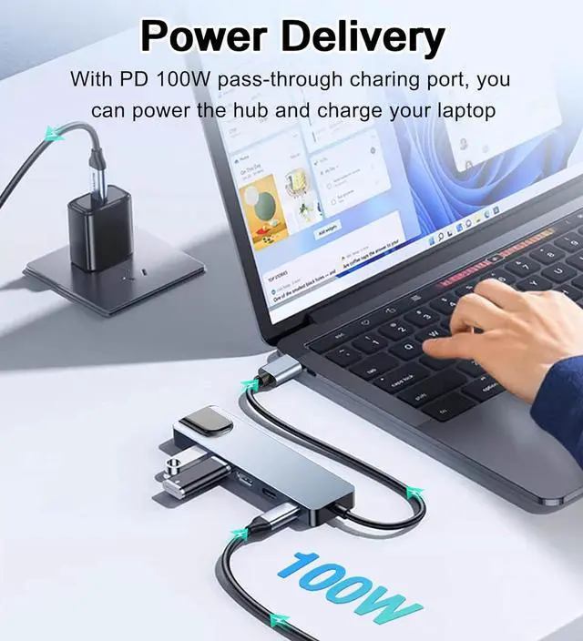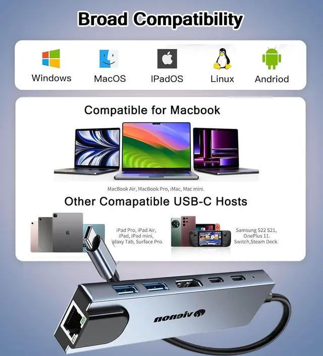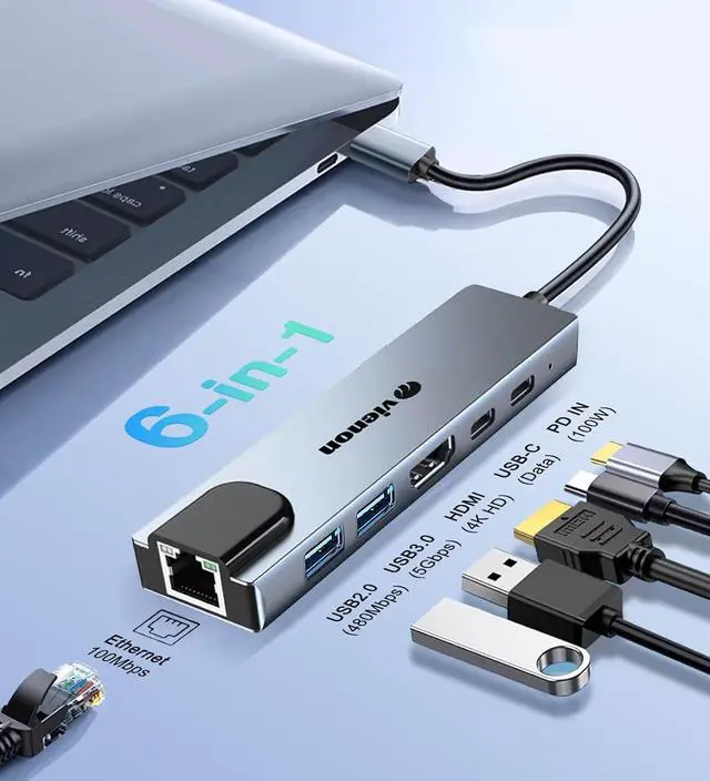 All Needs: This 6 in 1 USB C hub includes 1 *4K HDMI 1*RJ45 ethernet 1*USB A 3.0 1* USB A 2.0 1*USB C PD 100W charging and 1* USB-C data port. This USB C dongle applies to all Type-C laptops perfectly combined all the functions you need.