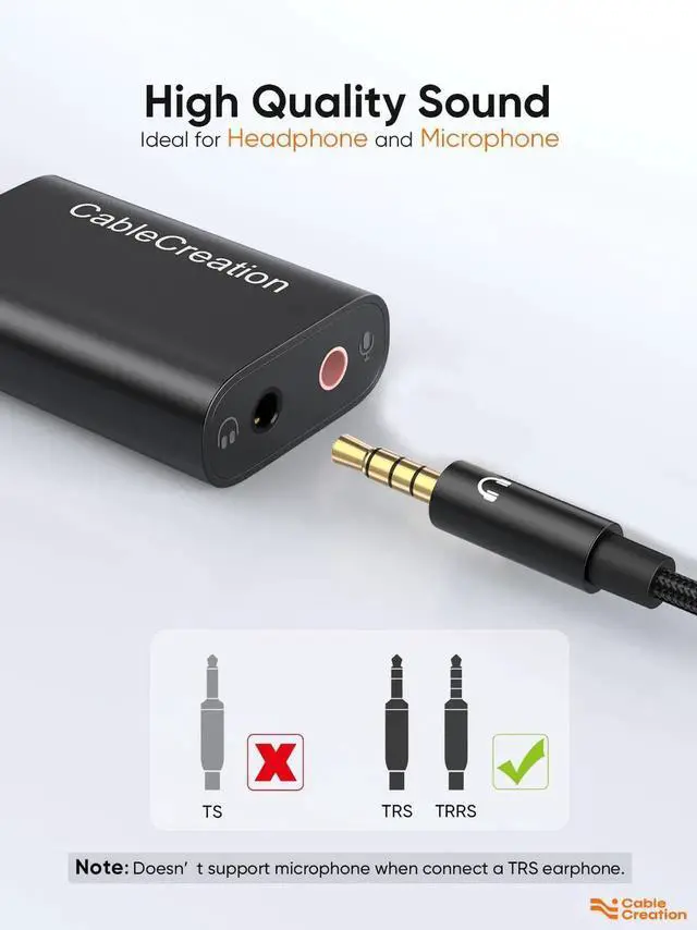 • 2 Ways to Use: Both TRS (headphones) and TRRS (headphones with microphone) are suitable for this audio adapter. 1. Insert TRS(3 pole) 3.5 mm microphone plug into PINK jack, and headphone plug into BLACK jack. 2. Simply insert TRRS (4 poles) 3.5 mm plug into BLACK jack. Then started to enjoy listening to music, chatting with families, exploring video game, living stream. (Attention: Apple AirPods and earphones were tested not support microphone input but only audio output with this adapter)