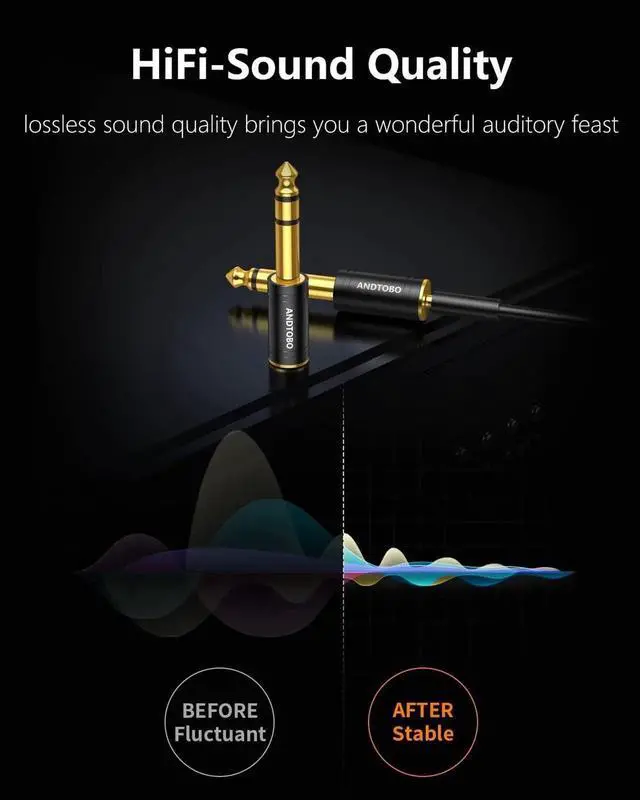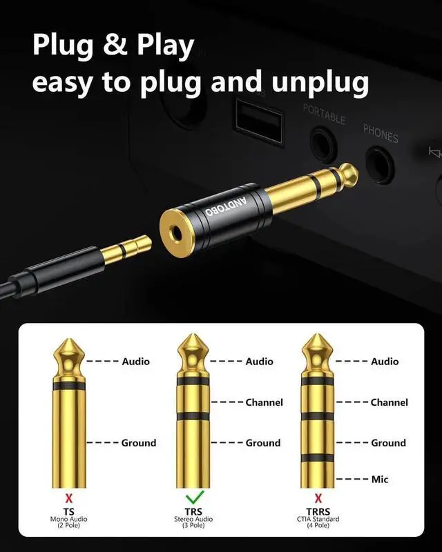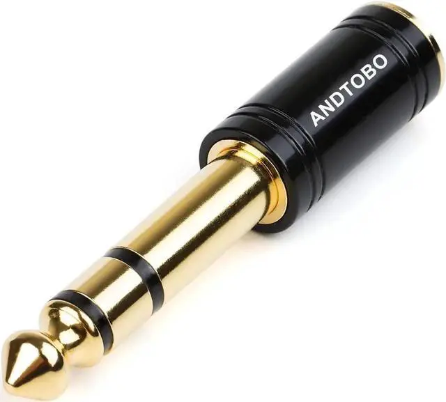 ANDTOBO TRS 3.5 mm female to 6.3 mm male 1/4 to 1/8 audio adapter allows you to connect your headphones or microphones with 1/8 inch plugs to audio devices such as home audio amplifiers guitar and piano with 1/4 inch stereo jack.