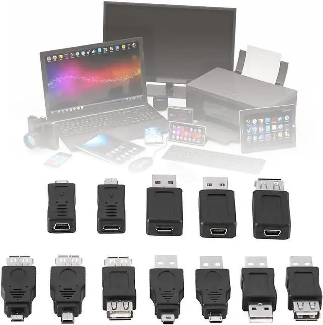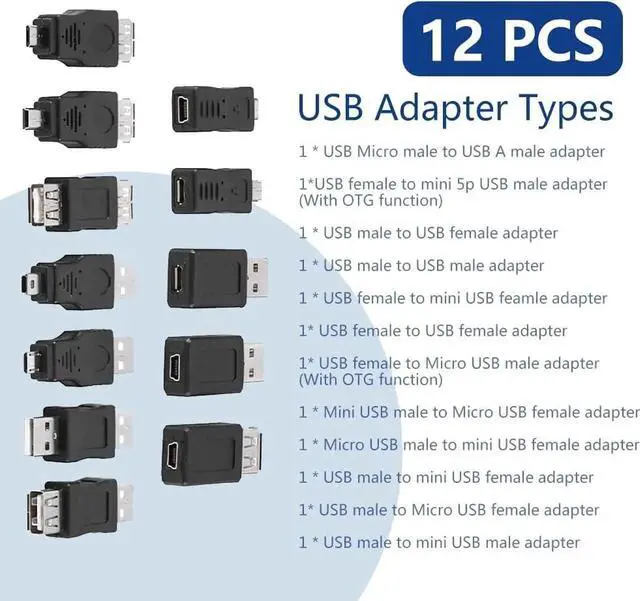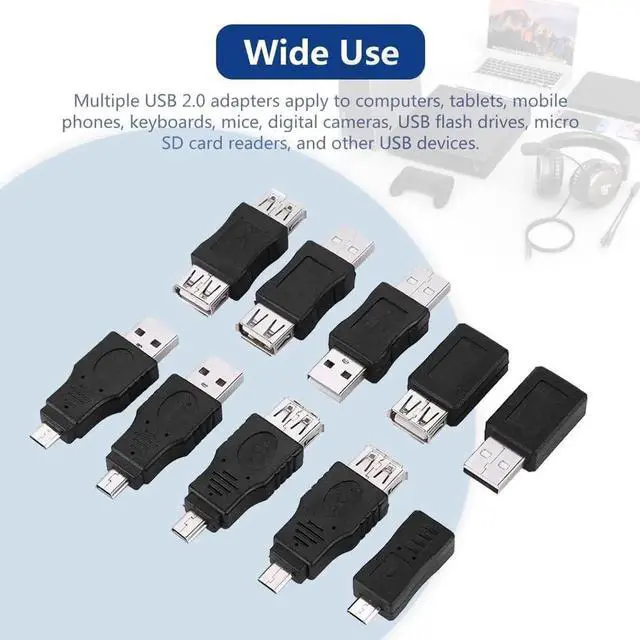 Multiple USB 2.0 AdaptersMale female converters connectors contain 12 USB 2.0 adapters with different male and female converters available to you. Good CompatibilityThe USB adapter kit helps you solve connection problems and is backward compatible with USB 1.1 / 1.0. OTG FunctionThe OTG function enables your device to act as a host for other devices helping you work more efficiently. Wide UseMultiple USB 2.0 adapters apply to computers tablets mobile phones keyboards mice digital cameras USB flash drives micro SD card readers and other USB devices. Easy To Use Plug and play easy to operate you can use by different conditions to carry out data transmission and charging.