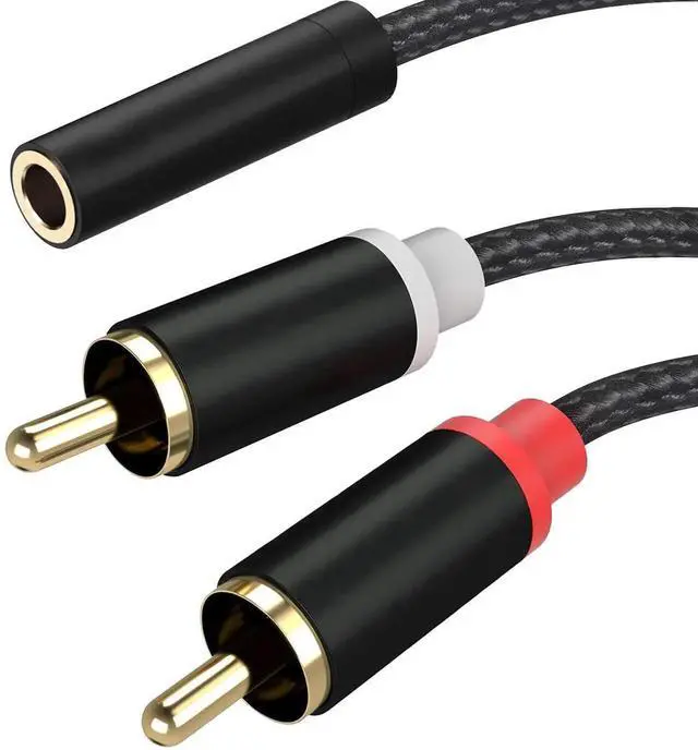 Universal Compatibility: The Mini Jack to 2RCA Phono Stereo Audio Cable is compatible with devices with 3.5 mm aux ports such as the Pod Phone Pad Galaxy smartphones and tablets PC MP3 players for connecting to popular audio speakers with RCA ports such as a Stereo Receiver Amplifier Speaker TV AV receiver amplifier projector radio and more devices which equipped with RCA connectors.?? The RCA to 3.5 mm female Phono Stereo Cord features soft nylon braid jacket to prevent tangles.??