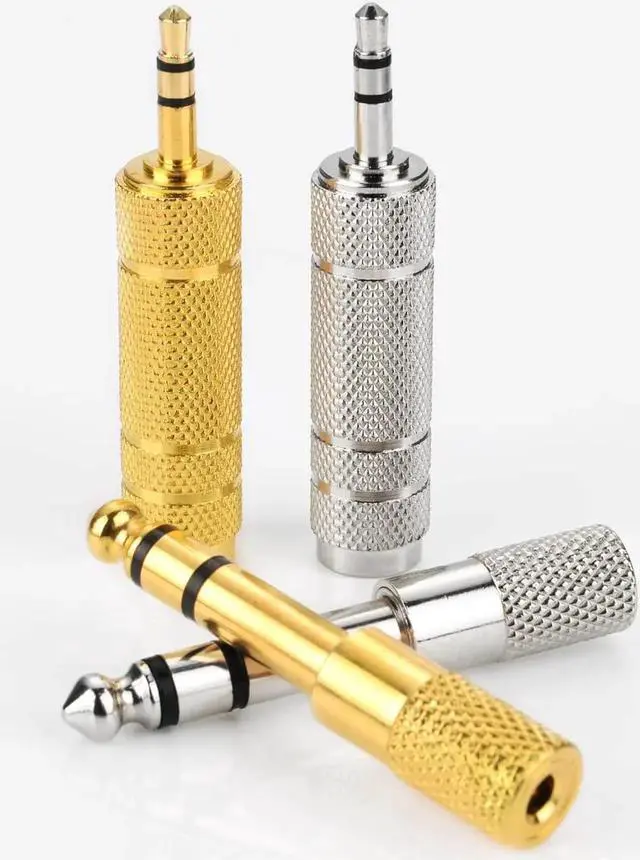 Headphone adapter set: 2 types of adapters are included 6.35 mm (1/ 4 inch) male to 3.5 mm (1/ 8 inch) female and 3.5 mm (1/ 8 inch) male to 6.35 mm (1/ 4 inch) femaleDurable material: these audio stereo plugs are made of metal durable and anti-rust resists corrosion ensures minimal signal lossSpecial design: 360 degree grip treads help easy plugging and unplugging do not need to distinguish the positive and negative side convenient to useStereo adapter application: allows your headphones or other devices to be compatible with most pro audio and home audio equipments with 6.35 mm socketQuantity: 4 pieces of headphone adapters in total in 2 types each type has 2 pieces one is golden and another is in silver color