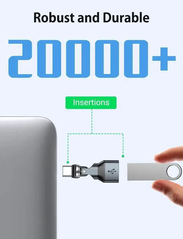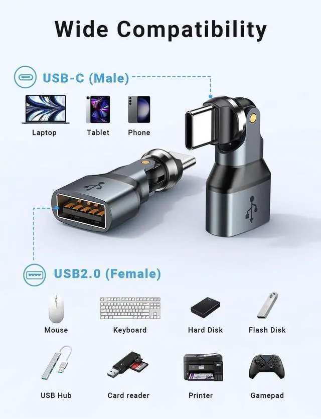 540° Rotating DesignOur innovative USB to USB C adapter boasts a unique 540° rotating design combining both 360° and 180° capabilities. This means you can adjust it to find the ideal angle for charging and data transfer eliminating the frustration of tangled cables. Whether youre at home in the office or on the go this USB-A to USB-C adapter adapts to your lifestyle providing you with ultimate convenience and flexibility in any scenario making it a must-have accessory for your devices. Plug-and-Play OTG FunctionalityWith the advanced USB On-The-Go (OTG) support you can transform your smartphone or tablet into a versatile workstation.
