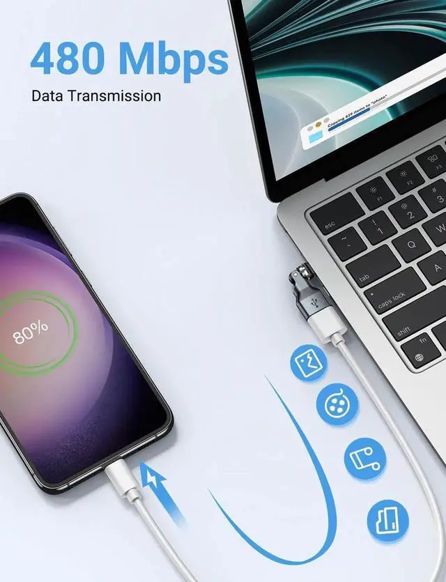 Effortlessly connect flash drives to transfer files or attach peripherals like mice and keyboards. There's no need for additional drivers! Just plug it in and instantly enhance your devices functionality allowing you to maximize your productivity and enjoy a seamless user experience. Data Transfer Up to 480 Mbps and ChargeBy supporting USB 2.0 and OTG. Experience the power of high-speed data transmission with our USB-C to USB adapter achieving speeds of up to 480 Mbps. This allows you to quickly sync photos videos and essential files in a fraction of the time ensuring that you spend less time waiting.