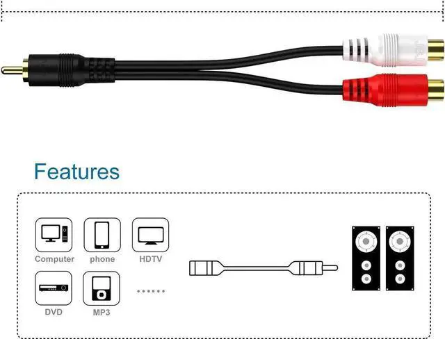 ?? This RCA adapter can be used to divide a mono signal source into 2 signals or combine a stereo source into a mono signal.?? Copper braided and aluminum foil shielding provide cable flexibility and greatly reduce undesired EMI/RFI interference.?? Y Adapter splitter cable with 1 RCA Male to 2 RCA Female plug stereo audio adapter extension cord connectors.?? 24K gold-plated connectors resist corrosion and reduce tarnish precision molded terminals and high quality.?? What You'll Get 2xRCA (Male ) to 2 RCA (Female) Stereo Audio Y Adapter Subwoofer Cable and Lifetime Technical Support backed by 24/7 friendly customer service.