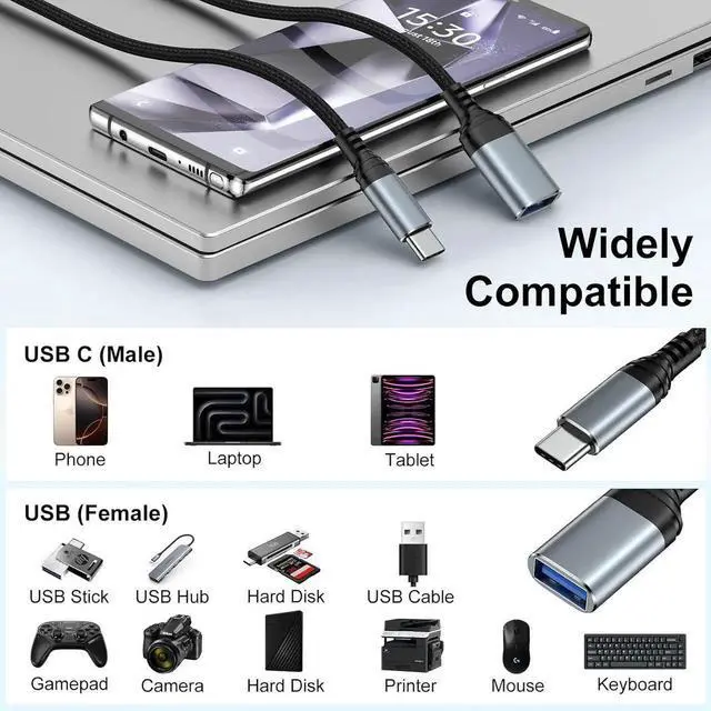 USB Type-C Port devices (phone/laptop/tablet): iPhone 16 Pro Max/16 Plus/16e/16 Pro/16 iPhone 15 Plus/15 Pro Max/15/15 Pro Galaxy Z Flip 7/6/5 Z Fold 7/6/5 S25 Ultra/S25 Edge/S25 Plus/S25+/S25/S24 FE/S24 Ultra/S24 Plus/S23 FE/S23 Ultra/S23 Plus/S22/S21 FE/S20 Google Pixel 9a/9 Pro/9 Pro XL/9 Pro Fold/8/8Pro/7/7Pro/7a/6a/6/6 Pro/5/4a xl/3xl MacBook Pro/Air iPad Pro/Air/mini and other USB-C devices. On-the-GoPlug & PlayNo drivers or software required just simply plug in the USBC to USB adapter and start using instantly. Effortlessly connect USB accessories to your USB-C devices with a stable and secure adapter connection. Provides a seamless user experience when connecting webcams mouse bluetooth receivers keyboards. The USB C to USB Adapter support side-by-side use won't block adjacent USB-C port. USB C Dongle Adapter delivers a smooth hassle-free experience wherever you are. Durable & FlexibleBuilt with a reinforced braided cable premium ABS housing and high-quality shell that help dissipate heat during charging and data transfer this USB to USB-C otg adapter is tough enough to handle daily wear and tear resist stretching and deliver long-term durability you can count on. Compact and lightweight build makes it perfect for travel. Easily connect flash drives keyboards game controllers and other USB accessories. Please note that this USB C male to USB A female adapter does not support audio playback or in-line control.