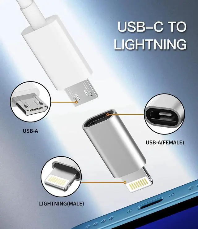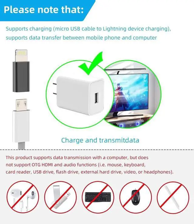 Fast ChargingSupport fast charging and data transmission fast charging your Lightning devices. Providing fast charging at 5V 2A efficient charging for lesstime. but also practical and Reliable it would be the best choice for you. (Please note!! This is a charging conversion adapter from a micro usb female jack (supports connecting a micro usb cable) to a Lightning male jack (supports connecting Lightning devices such as for iphone14 13 12promax). It supports data transmission between mobile phones and computers but does not support OTG HDMI and audio functions (i. e. mouse keyboard card reader U disk flash drive external hard disk video is not supported (nor headphones) )