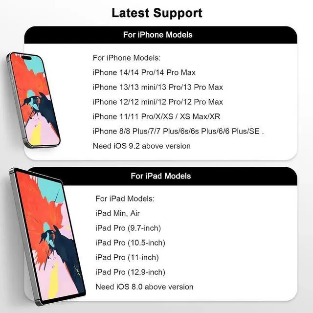 . support all iPhone with iOS 9.2 and up and iPads with iOS 8.0 or later.