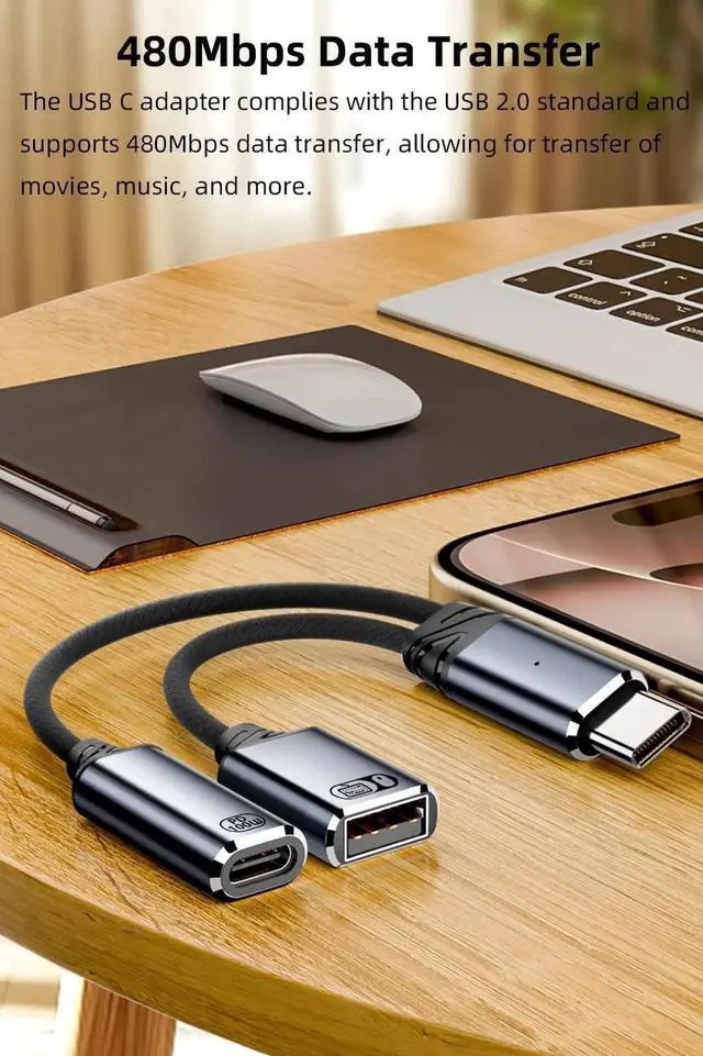 Not suitable for these situations:? Not Support power output and only one port supports power input.? Not Support any video transmission. 2-in-1 USB C OTG with ChargingWhen you use this adapter to connect a keyboard mouse USB flash drive USB card reader etc. to your USB C host device you can also charge the host device at the same time. 100W PD Fast ChargingThis adapter can provide up to 60W (20V/5A) PD charging It will not reduce the original charging speed of your device. 480Mbps Data TransferThe 2-in-1 USB C adapter complies with the USB 2.0 standard and supports 480Mbps data transfer allowing for transfer of movies music and more. Compact and DurableThe adapter made of a durable aluminum alloy shell and high density nylon material cable which has good flexibility. No need to install any drives at the same time plug and play. Universal CompatibilityCompatible with iPhone 16/16 Plus/16 Pro/16 Pro Max 15/15 Plus/15 Pro/15 Pro Max iPad Air/Pro Galaxy S23/S23 Ultra/S23+/S22/S21/S21 Plus/ S20/Note 20/20 Ultra/10/10 Plus Galaxy Z Flip 5 Galaxy Z Fold 5 Pixel 7/6/5/4 and other usb-c devices.