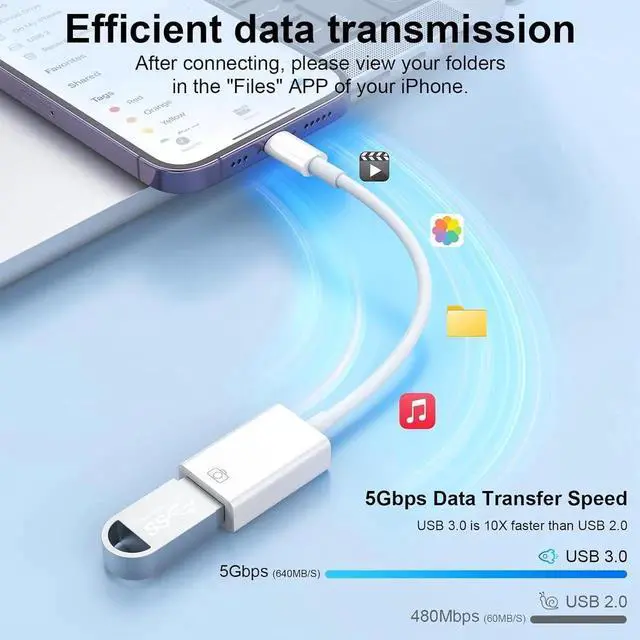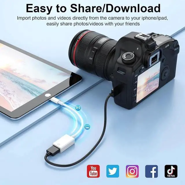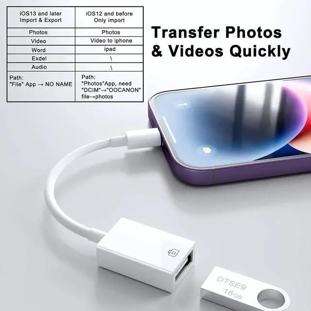 Export: The Lightning to USB Camera Adapter supports standard photo formats including JPEG and RAW along with SD and HD video formats including H. 264 and MPEG-4. Requires iPhone iOS 9.2 or later and iPads with iOS 8.0 or later. Supports two-way data transfer for iOS13 and above you can import pictures videos MP3 files MP4 files Excel Word PPT PDF import and export files or photo app from the plug camera to iPhone/iPadPlug and