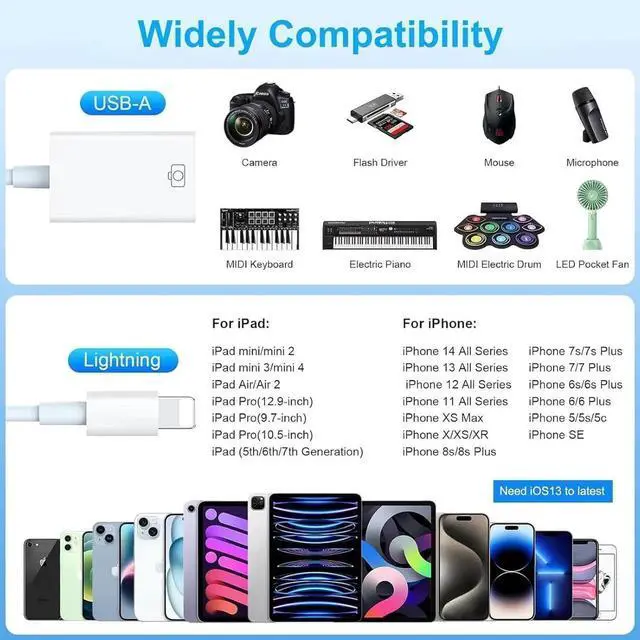 Compatibility: This usb to lightning adapter compatible with iPhone 14/13/12/11/X/XR/XS/8/7/6/6s/5/5s/5c iPhone Pro 14/13/12/11 IPhone Pro Max 14/13/12/11/XS iPhone Plus 14/8/7/6/6s iPhone SE 1/2/3 iPhone mini 13/12 iPad Pro 10.5 in/ 9.7 in iPad Pro in 2/1 iPad Air 3/2/1 iPad mini 5/4/3/2/1 iPad 9th Gen and older.