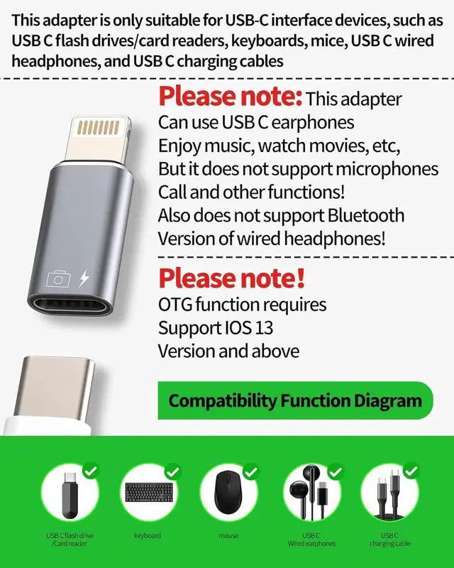 Please note: The adapter can connect USB C wired headphones to listen to music and watch movies but it does not support microphone calls and other functions!! It also does not support headphones with Bluetooth versions! Charging FunctionThe Adapter can be used for charging your lightning Devices. An suitable solution to charge and sync Lightning devices by a USB C cable saving the trouble of carrying extra cable around. Directly makes Lightning devices compatible with USB-C cable. Enables your Lightning machine to connect a USB-C cable. (Only low-power devices are supported: USB-C flash drives/card readers keyboards mice USB-C charging cables and USB-C wired headphones (audio playback only not for calls or microphone).