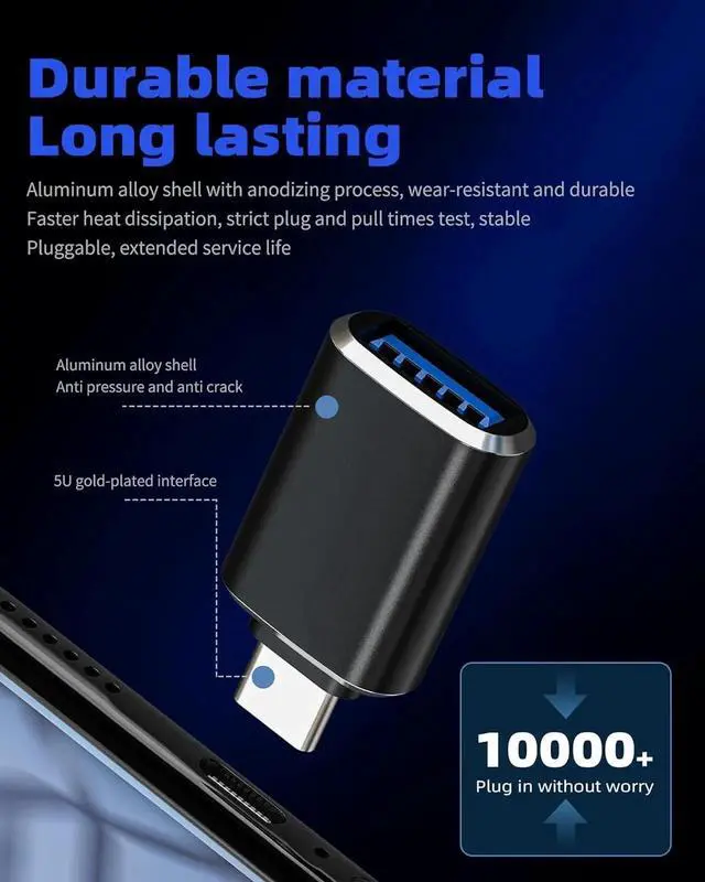 USB 3.0 Super Speed Transfertype c port dongle accessories Full USB 3.0 super speed data transfer up to 5Gbps 10x faster than USB 2.0. Transfer files HD movies and songs to your USB-C devices in seconds. Good Office Helperthunderbolt converter Connect the keyboard you can type faster on ipad improve office efficiency. Connect U disk you can watch video or picture that saved in U-disk directly on your phone. Connect the mouse game to have a better gaming experience. Multi-purpose This Phone to USB Female adaptador supports USB flash frive camera card reader keyboard mouse USB headset USB microphone MIDI keyboards digital pianos mice keyboards USB hubs etc.
