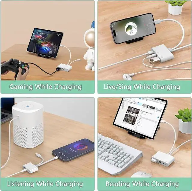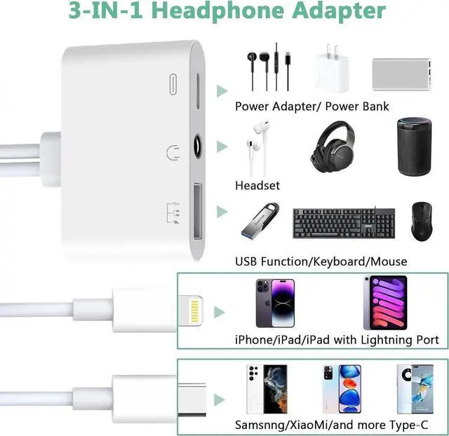 USB Camera + 3.5 mm AUX Audio + Type-C Phone Charging Port/Type-C Headphone Jack Adapter supports USB camera card reader and 3.5 mm/Type-C headphone audio and charging functions. Connect the USB OTG adapter to the keyboard can fast typing when chatting by your Phone or Pad. It is a multifunctional and practical adapter and compatible with both lightning and USB C devicesThis 3 in 2 iPhone 3.5 mm/Type-C headphone headset earphones adapter has a built-in premium DAC chip you can get the better music experience from it. The 3.5 mm female port compatible with CTIA and OMTP.