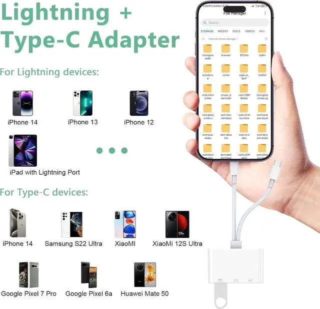 And support listen to music and charge your phone at the same time with iPhone charging port( NO---2 types of headphones cannot be used at the same time!!! ). This Universal 3.5 mm headphone adapter USB compatible with iPhone 15/15 Pro Max/14/14 Pro/13/13 Pro/12/12 Pro/11/11Pro/XS /XS Max/XR/8/7 Pad4 Pad Air Pad mini. Type-C for Galaxy S10 S9 S8 Note 9 8 LG G5 G6 V20 Google Pixel Google Nexus 5X 6P MacBook Air/Pro Surface Pro 9/8 P9 10 Lumia 950 Lumia 950 XL/Moto Z and so on. This lightning/USB C to USB adapter supports transferring files to USB-C devices (such as Excel Word Txt PDF MP3 MP4 JPEG RAW etc.